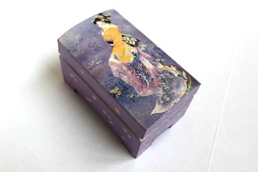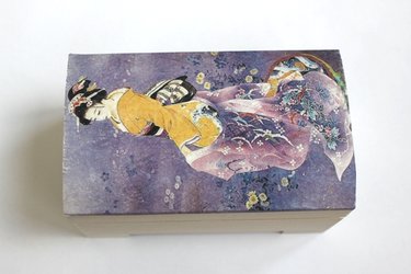 Ножницами аккуратно вырежьте рисунок из декупажной карты. Нанесите на крышку шкатулки клей ПВА тонким слоем и приклейте картинку. Не торопитесь, чтобы не порвать ее. |