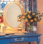 Вам понадобится: акриловая краска для основы, голубая масляная краска для тумбы, масляная краска цвета слоновой кости для зеркала, белая масляная краска для орнамента.